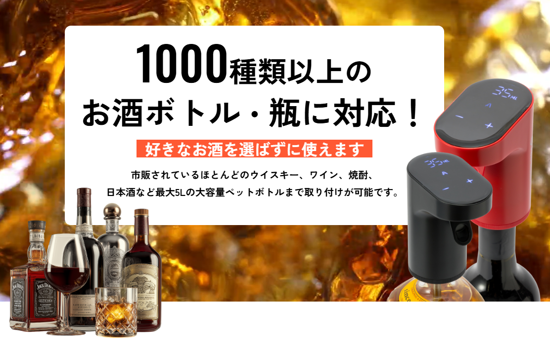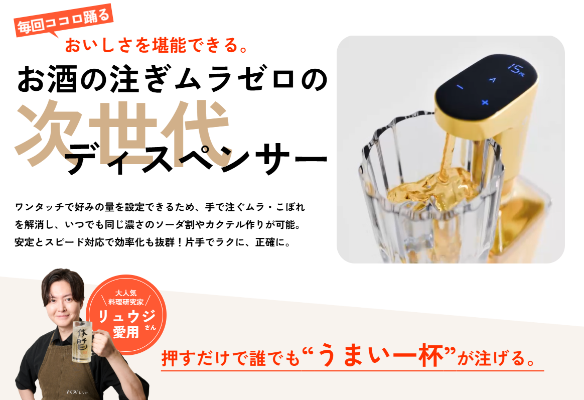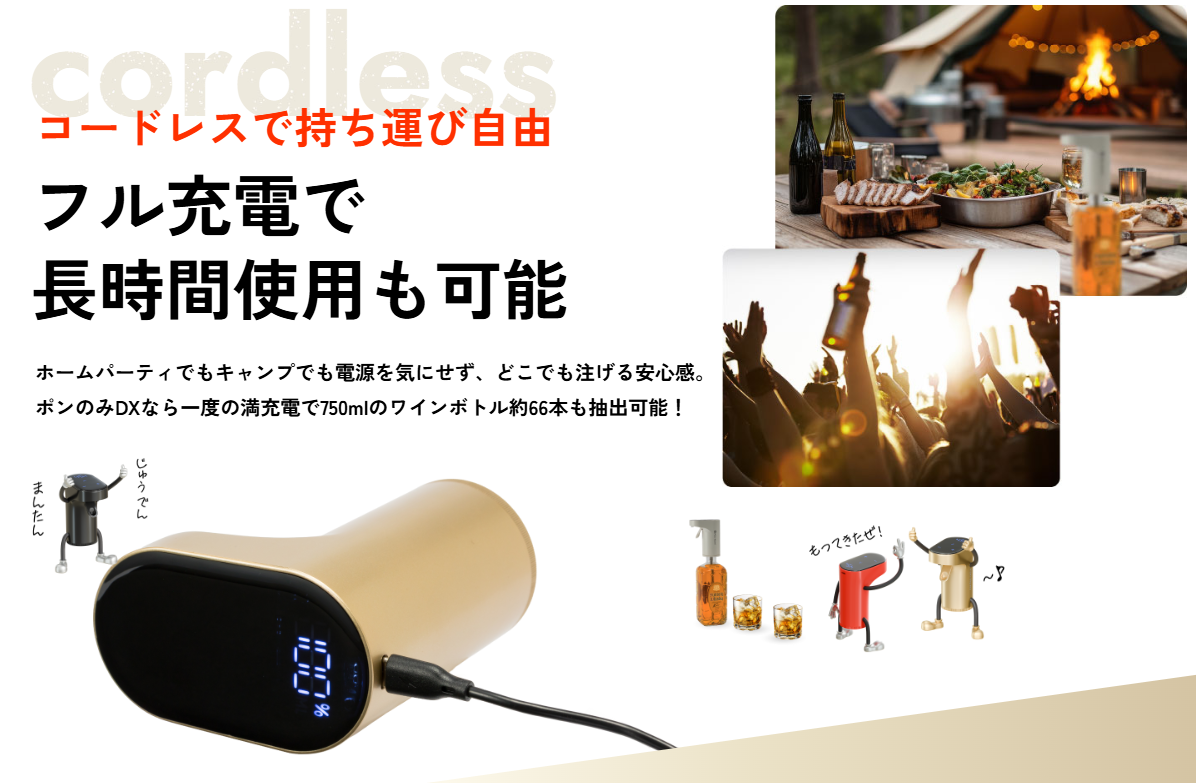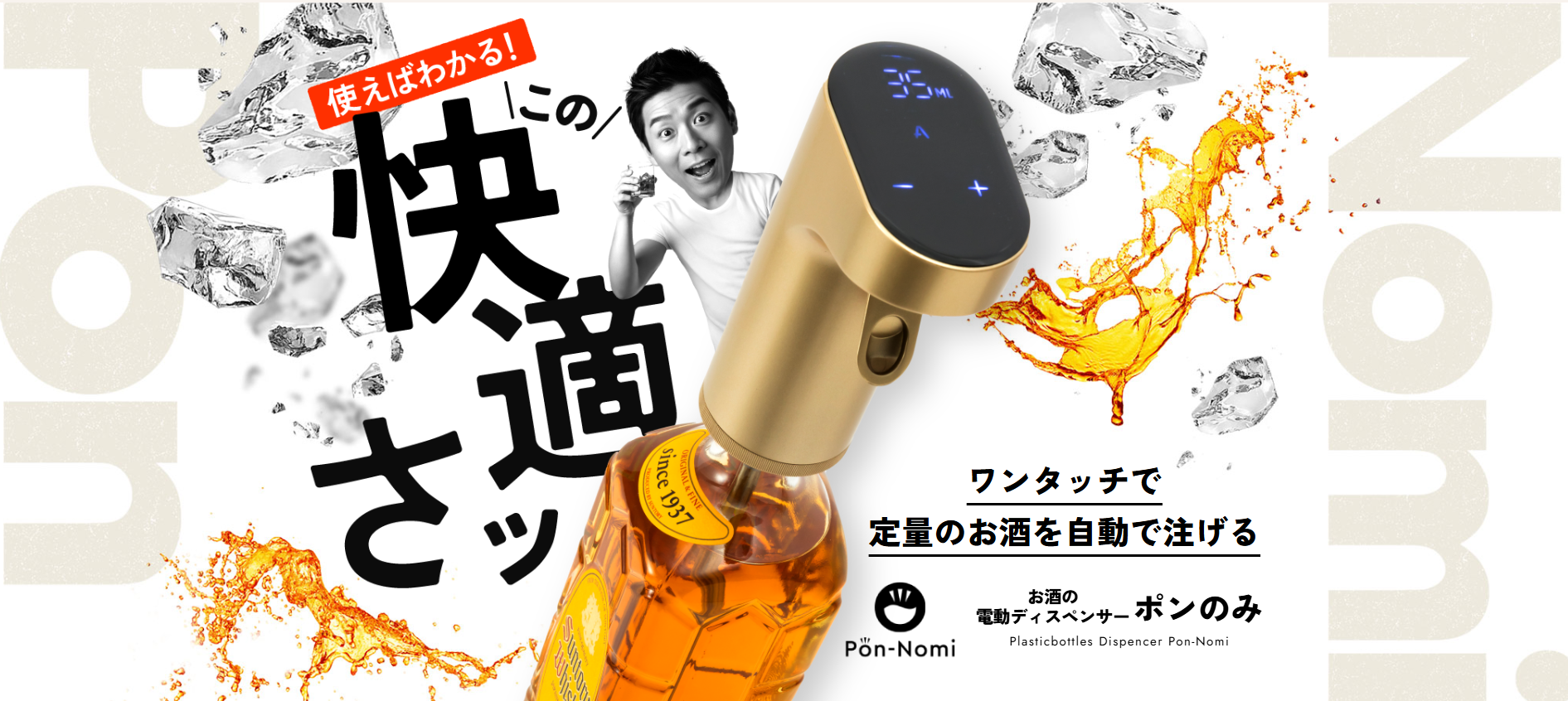 「ポンのみ」は、お酒をより手軽に楽しむために開発された電動ディスペンサーです。ボトルにセットするだけで、ボタンひとつで一定量のお酒を注ぐことができるため、自宅での晩酌や来客時にもスムーズな提供が可能になります。手で傾ける必要がないため、こぼれや量のバラつきを抑えながら、安定した注ぎを実現できるのが特徴です。