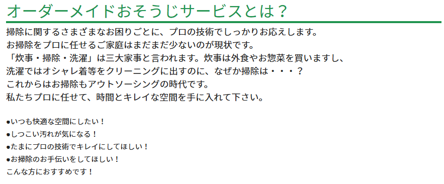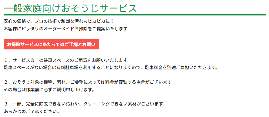 また、利用者のライフスタイルに合わせて、月1回・2ヶ月に1回など頻度を選べるのもポイントです。必要な箇所だけを依頼することもできるため、無駄なく効率的に利用できます。